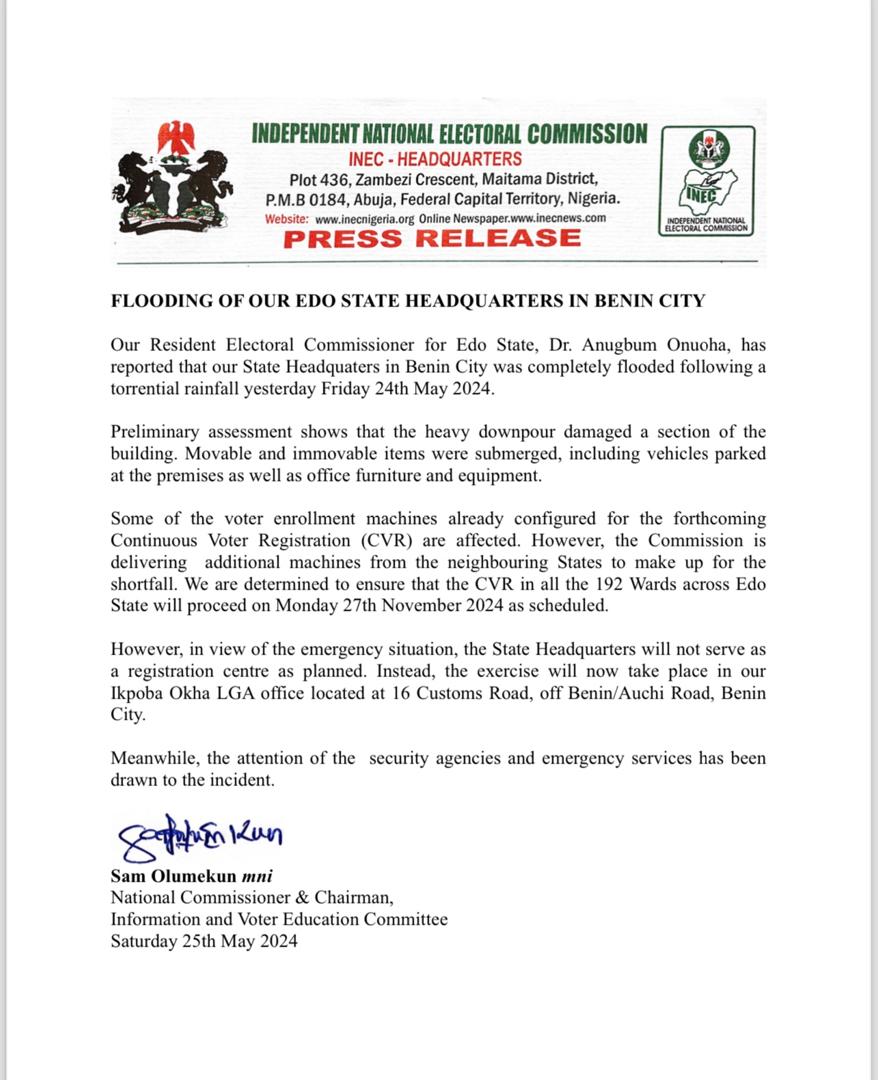 By Charles Okogene The yesterday, Friday 24, 2024 heavy rain that led to the flooding in parts of the Edo…